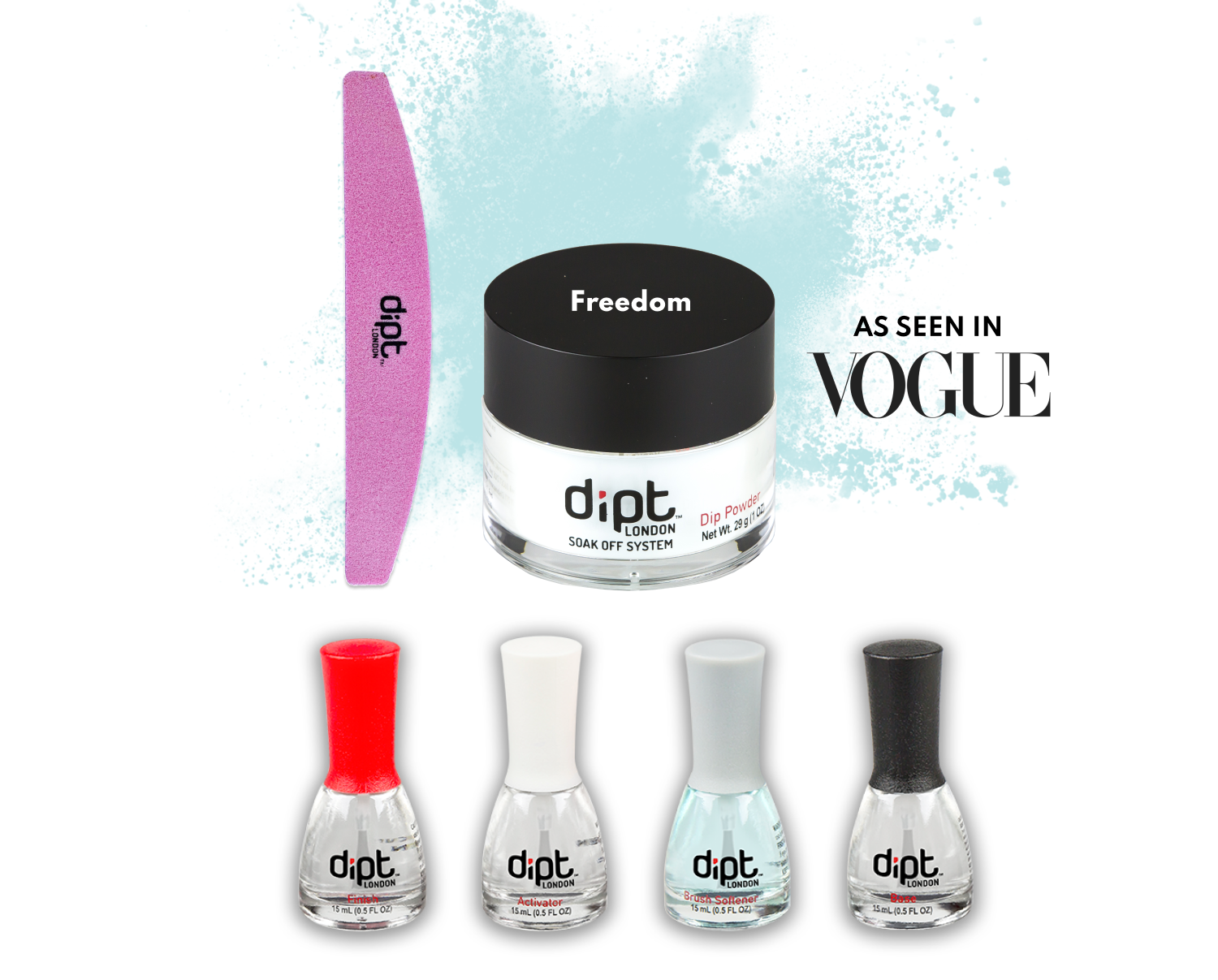 Shake off the winter blues with this pale, fresh shade of blue.The kit includes, 1oz FREEDOM powder, all 4 liquids and a Flamingo Finishing file.