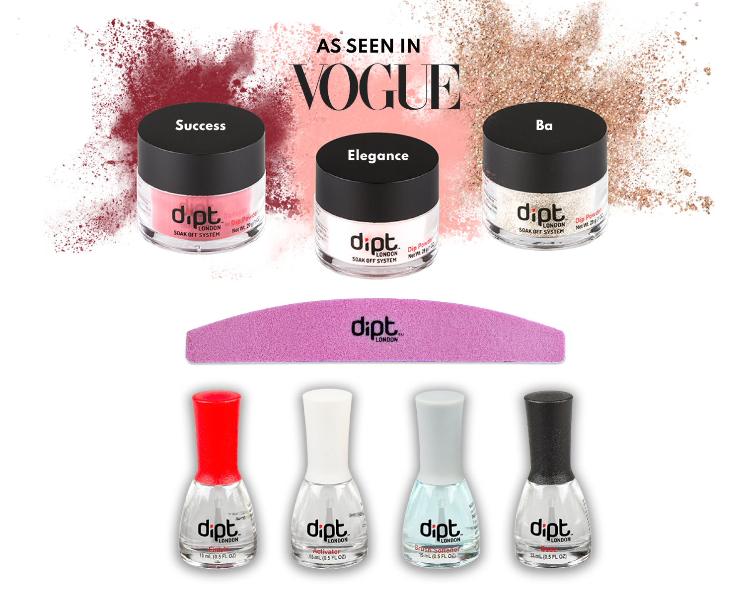The kit includes, 1oz of each powder – BA, SUCCESS & ELEGANCE, all 4 liquids and a Flamingo Finishing file.